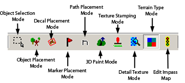 The Mission Editor has a set of buttons in a toolbar that can control various aspects of the ME. These buttons are separated into four different groups. The Cut & Paste buttons, allow you to edit your mission quickly and easily. The Undo, Redo buttons allow you to undo or redo any changes that you have done easily. The Modes buttons allow you to directly manipulate the mission that you are working on. Finally, the ErrorButtons are used for debugging your map.
