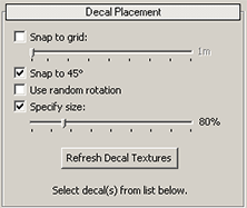 The Decal Placement Mode allows you to place Decals onto the terrain. Decals are basically textured objects of geometry that get applied directly on top of terrain. When decal placement mode is selected the toolbar window displays three separate roll ups: